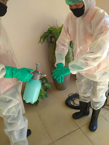 2. ฉีดสเปรย์ฆ่าเชื้อ อุปกรณ์ที่มีโอกาสใช้มือสัมผัส เช่น ลูกบิดประตู, มือจับประตู, โต๊ะ,เก้าอี้ ปุ่มกดลิฟท์ เพื่อป้องกันการแพร่เชื้อระดับสายตา